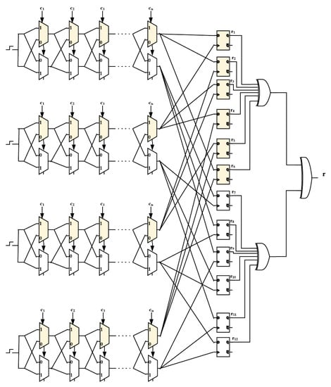 Performance evaluation on XOR PUF is well reported in the literature [10,19,20,21,22,23] using different components (also known as streams) and number of stages. However, there is very limited number of research conducted on the implementation and experimentation of DAPUFs. Authors of [24] have examined and compared three different designs which are XOR PUF, PAPUF, and DAPUF. However, their implemented design of DAPUF, shown in Figure 3, is not similar to those implemented in [11,18]. In particular, the response from each arbiter has to be XORed to generate the one-bit response of any DAPUF design, a part that has prevented them from conducting their analysis on different DAPUF designs. The only paper that reported performance analysis on all DAPUF designs is from the same authors that proposed the design of DAPUF [11], in which they analyzed the performance of DAPUF and compare it with that of XOR PUF using three evaluation metrics.