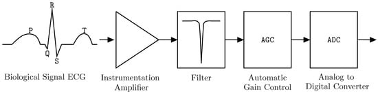 Chronic diseases are considered the main cause of death in the world, with cardiovascular, oncological and respiratory diseases, as well as cerebrovascular accidents and diabetes comprising 54% of deaths in 2016 [1]. In recent years, mobile technologies, in conjunction with biomedical systems, have been used to aid in the recognition of diseases and patient management. These systems provide direct and regular monitoring of important vital signs, such as heart rate, blood oxygen saturation level, body temperature, respiratory rate, blood pressure in the circulatory system [2], and can be used as clinical tools to observe a particular disease or provide a better understanding of a user’s health status. Since the electronics industry is in continuous advance, there is a tendency in the monitoring of biological signals towards reducing device size and power consumption. As shown in Table 1, these signals range from a few microvolts (V) to hundred of millivolts (mV), which makes it difficult to obtain an accurate reading, especially when assessment is done in a noisy environment. The block diagram of a portable biomedical system for ECG signals is shown in Figure 1 [3]. The low frequency electrode signal (0.01–300 Hz), is injected into an instrumentation amplifier coupled in AC, which amplifies the signal up to a range of 32 dB to 40 dB, and filters the common-mode noise and electrode offset [4]. Subsequently, the filter (Reject Band) rejects the power line noise (50 Hz–60 Hz) [5]. The next stage is a variable gain amplifier (VGA) [6], which changes its gain in order to maintain the output signal within optimal values for an analog-to-digital converter (ADC). This paper proposes the use of an Analog Automatic Gain Control (AGC) to handle amplitude changes in biomedical signals to adequate the signal into the input range of the ADC.
