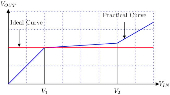 Ideally, an AGC will keep the amplitude of its output signal constant despite amplitudes changes at its input [19]. An AGC is typically a feedback system, which can be represented in terms of a nonlinear transfer function. The ideal transfer function for an AGC scheme is depicted in Figure 2. With an input signal lower than a voltage threshold , the AGC will not work and the output signal is a linear function of the input. When the output signal passes the threshold value (), the AGC works and maintains an approximately stable level at the output until it enters a second threshold value (). After passing this threshold it stops functioning correctly due to the saturation of the output signal. The operation thresholds discussed above are determined by a reference voltage , which regulates the amplitude of the output signal.