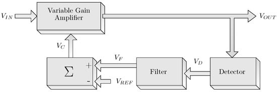 The main feature of the configuration shown in Figure 3 is its requirement of a single detector with a low dynamic range, as well as its high linearity. The input signal is injected into a variable gain amplifier (VGA) controlled by the signal, which closes the loop. Some parameters of the output signal, such as amplitude, carrier frequency, modulation index or frequency, are sensed by the peak detector, after which the undesirable components are filtered. The signal is then subtracted by voltage reference to generate the signal, which controls the VGA to adjust the loop gain and therefore keep the amplitude of the output signal at a constant level. The mathematical description of the transfer function is taken from [24].