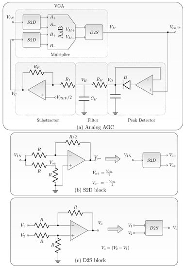 The proposed CMOS analog AGC is shown in Figure 4a, and implements the Variable Gain Amplifier () with a four-quadrant multiplier. As to the selected CMOS multiplier uses differential input and output signals, a differential-to-single (D2S) and single-to-differential (S2D) converters are required. A peak detector was selected in order to extract the output signal amplitude and a simple RC circuit was used as the filtering block. Finally, a difference amplifier closes the feedback loop.