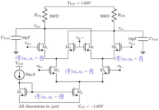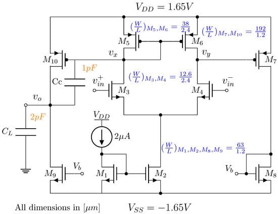- We determine the necessary transconductance of differential pair () for a GBW = 2 MHz and a lod capacitance() of 2 pF as shown in Equation (1).