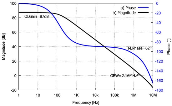 Figure 5, all transistors operate in the saturation region and results of this amplifier present a DC open-loop gain () of 87 dB, gain-bandwidth product (GBW) of 2.2 MHz and phase margin of 62 as shown in Figure 6. Experimental voltage offset () refered to input of 1.2 mV and power consumption of 6.6 W.