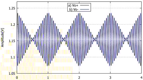 The multiplier used for this work is the well-known Gilbert cell [26] shown in Figure 7, which is comprised by 6 transistors operating in the saturation region (–) and a bias current mirror (–). The design of this circuit was proposed using equation 1 for a = 4 MHz and a capacitance of 10 pF due to the load represented by an internal pad, thus obtaining a = 251.32 s. The aspect ratio was obtained by means of Equation (2) with values of = 0.1 and current through = 12.5 A, obtaining () = 23. The same Figure 7 shows the transistor sizing and bias conditions. This multiplier presents a gain of 7.4 dB, a GBW of 4 MHz, a linear range of 150 mV and a power consumption of 165 W. For the transient simulation of this circuit two differential signals were used: a sinusoidal of 100 mVp amplitude at 10 kHz frequency, and a triangular signal of 100 mVp amplitude at 1 kHz frequency. The output voltage of this multiplier is shown in Figure 8, where a gain of ≈2.5 and a DC level of ≈1.2 V can be seen.