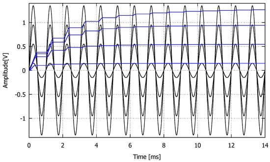 There are a wide variety of peak detectors, which can realize by diodes or by MOS transistors [8,20]. The diode is constituted of 3 structures within a well type N, which is located into the substrate (type P) of the IC; in the well, there is a main P-type diffusion, surrounded by an N-type diffusion ring and enclosed by another P-type diffusion ring as shown in Figure 9. A super diode structure was used for realizing the peak detector. This structure is essential as the threshold voltage of the diode (for silicon Vth = 0.7 V) is divided by the open-loop gain of the OPAMP and reduced to a value close to 0 volts. The operating frequency of the peak detector is determined by the expression . If the operating frequency changes, and must be recalculated. The maximum frequency of the AGC is mainly restricted by the OPAMP. Since the 0.5 m technology does not provide characterized diodes nor their models, it was necessary the diode characterization. The transient response of the peak detector when applying a sine wave signal with a frequency of 1 kHz with different amplitude values, between 0.15 V–1.2 V is shown in Figure 10. It can be seen that the settling time depends on the signal amplitude. The next block is the filter, which is a simple RC circuit, hence it does not need any discussion. However, this block along with the peak detector determines the maximum operating frequency.