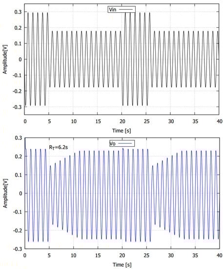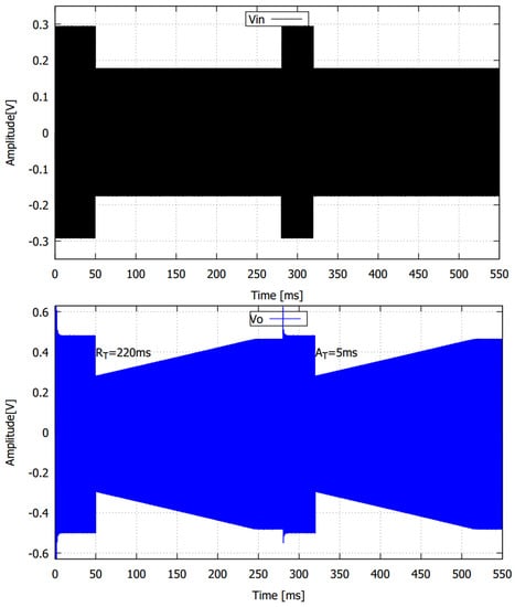 Simulation results of the Analog AGC were obtained using a sinusoidal signal which amplitude varies from 300 mV to 180 mV at a frequency of 1 kHz, as shown in Figure 11 (In the upper and lower of this figure the input and output signal are shown respectively). Settling time is calculated by Equation (8), is a voltage reference, the constant = 2.45 mV indicates linear gain control slope and , C are the transconductance and capacitance of the peak detector. Figure 11, we use = 500 mV and get a release () and attack () time of 220 ms and 5 ms respectively. Under the same input signal conditions and with an increase of C, is obtained a of 32 ms and negligible, as shown in Figure 12. Figure 13 shows the simulation results for a sinusoidal input signal at a frequency of 1 Hz. The AGC controls the output signal at Vref = 220 mV, obtaining a of 6.2 s and negligible. The results can be applied to amplitude control an electrocardiogram (ECG) signal.