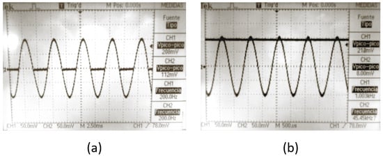The electrical characterization of the analog AGC was performed under the same conditions as the schematic simulation level shown in Figure 4a. In Figure 17a a = 500 mV with a release time of 210 ms and attack time of 10 ms is used while in Figure 17b, is equal to 700 mV with a release time of 200 ms and an attack time of 20 ms is used. Table 2 shows a comparison of simulation and experimental results. A summary of the characteristics of the operation of different AGCs is shown in Table 3. They were used for hearing aids [16], sensor calibration [10], and Bionic Ears [17]. This work presents a lower power consumption, configurable operating frequency, lower consumption of silicon area despite being designed in technology of longer channel length [10,16,17] and reconfigurable frequency of operation, attack time and release.