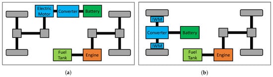 Possible architectures for a TTR HEV. (a) One axle is driven by the internal combustion engine, while the other is driven by an electric motor; (b) Electric motors are mounted directly inside the wheels (In-Wheel Motor).