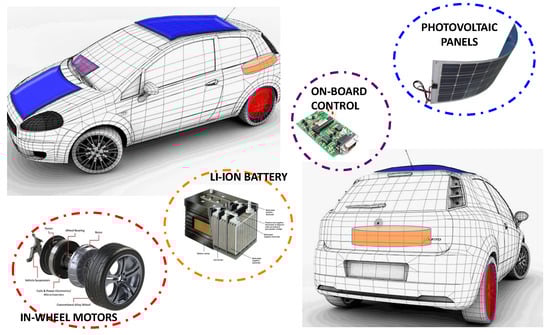A proposal of car hybridization, also including solar recharging by PV cells, has been formulated and patented at the University of Salerno (Italy) [19,22,23,24,25,26,27]. The hybridization kit consists in two in-wheel motors, an additional Lithium-ion battery, solar photovoltaic modules installed on the vehicle body and a control unit for the electric powertrain. A schematic depiction of the hybridization kit is shown in Figure 2. A FIAT Grande Punto, shown in Figure 3, has been converted in a solar assisted TTR parallel hybrid electric vehicle.