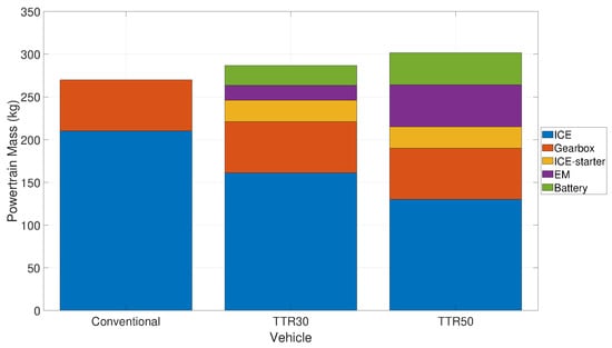 Figure 4 shows the weight distribution of the powertrain components for two HEVs and reference conventional one. The chassis mass and the gearbox mass has been kept stable for the three mentioned vehicles. Due to the fact that the ICE is mechanically connected to the wheels, the gearbox cannot be omitted in the hybrid vehicles. Both hybrid vehicles are heavier than the conventional one, but the mass increment is very small with 12 kg and 27 kg for TTR30 and TTR50, respectively. This is due to the power density of the battery, which is undeniably high for both vehicles. The mass of the EM was found to be approximately 75% of that of the battery. The TTR50 is slightly penalized in terms of weight, as the specific power of the ICE installed in TTR50 (538 W/kg) is lower than one of TTR30 (621 W/kg), while the specific power of both the EM and battery installed in these layouts remains stable.