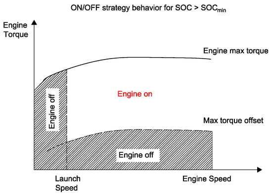 The “ON/OFF” control strategy (also called “Thermostat” or “Bang-Bang”) was firstly proposed for a series hybrid vehicle and after that is extended to the power flow control in a parallel HEV vehicle. Demanded torque of engine, quality of engine operation and launch speed (i.e., a pre-determined minimum vehicle speed) represent the main considerable factors of this strategy. In the condition in which vehicle demanded speed is greater than the launch speed, the ON/OFF strategy allows the vehicle to work in only engine, only electric motor and hybrid mode. On the contrary, whether the vehicle demanded speed is lower than launch speed only engine or only motor modes are available [34,35]. Figure 5 shows the operating modes of the strategy.