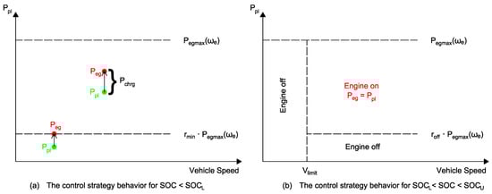 The Electric Assist Control Strategy (EACS) represents a commonly used rule-based control strategy [36]. It uses the ICE as the main power source and the battery to assist the ICE. The EACS operates with the battery when the ICE works inefficiently or the load demand is beyond the ICE maximum power. However, since there are many parameters to tune in the EACS, its design process is time and effort consuming. On the other hand, the ICE produces additional power to charge the battery when the SOC is low. The control rules of the EACS are presented in Figure 6, where , and are three tunable parameters determining the thresholds for the ICE activation, while is the additional power delivered by the ICE to charge the battery in addition to the propulsion load when the SOC value is low: