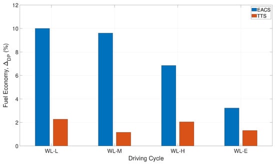 Comparison of fuel economy for the EACS and TTS relative to the performance of the DP, when driving the WL-L, WL-M, WL-H and WL-E [44].