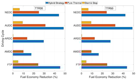 Considering the fact that DP strategy is time consuming, in Reference [31] a mathematical technique to speed up the calculation time has been proposed. The base principle of this method is in creating a matrix which includes outputs of the vehicle model (i.e., ICE chemical power and battery electric power). Since this matrix is evaluated only once before evaluating the optimal control strategy, there is no need to calculate it for each step, thus values can be easily obtained from the matrix for a given combination of the control variables. The most strong point of this method lies in the interaction among the model and permutations of control and status variables saved in the DP grid. Through this method the computational demand in MATLAB software is reduced since configuration matrix saves all the information considering the vehicle in all probable scenarios, and it can be easily interfaced with the DP grid by means of simple matrix operations [31]. This method proposed to lessen the computational time for all the optimizers resulted 15 times faster than DP-based ones. This approach has been applied to two types of TTR-already introduced in Section 3.2—with different degrees of hybridization, TTR30 (30% hybridization) and TTR50 (50% hybridization). Results in terms of fuel economy reduction in respect to conventional vehicle are shown in Figure 9.