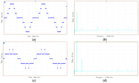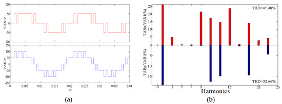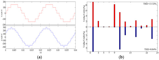 According to Figure 6a, it can be seen that the phase voltage VAN is 5 levels, while the line voltage VAB is 7 levels, which conforms to the design of the B band. From Figure 6b, it can be seen that the THD of the phase voltage VAN is 52.57%, in which the 5th and 7th harmonics are eliminated. The THD of line voltage VAB is 23.87%, in which the 3rd, 5th, and 7th harmonics are eliminated, which proves the correctness of the switch angle calculation.