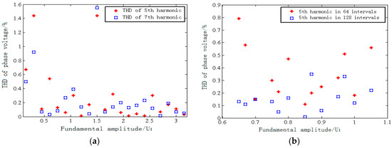 As shown in the Figure 8a, although the 5th and 7th harmonics have not been completely eliminated, there is a very small amount of error. The values are different under various modulation indexes. The errors indicate that the switch angles of the SHEPWM are not accurate, but they can be completely ignored in actual engineering control. From Figure 8b, the harmonic indexes in the 128-interval scheme are lower than the 64-interval scheme overall. This proves that the larger the interval scheme that is selected, the more precise the switch angels are and the better harmonic elimination effect it has.