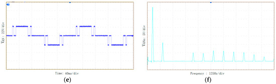 The output phase voltage VAN of the inverter under the SHEPWM modulation when the modulation index is 0.75 and its spectrum are shown in Figure 9a,b, respectively. Figure 9c,d show the output phase voltage VAN of the inverter when the modulation is 0.46 and its spectrum, respectively. Figure 9e,f show the output phase voltage VAN of the inverter when the modulation is 0.27 and its spectrum, respectively.
