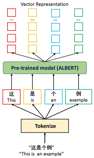 In this layer, we use ALBERT as the precoding model to initially encode the input information. Specifically, we use the pre-trained ALBERT model as a feature extractor to initialize the characters in the original corpus, that is, use the feature weights output by this pre-trained model. The advantage is that it provides a richer semantic representation for the input information and reduces the cost of model training in the later stage. The original input information after the initialization encoding can be directly used as the character embeddings of the enhanced encoding layer. Note that if the original input has not been preprocessed, we first need to clean the original data, cut the words, and tag the data. The schematic flow of initializing the input in this layer is shown in Figure 2. According to the design of our model, if we use function to represent the feature characterization of the ALBERT model, and is represented as the encoded feature vector, the relationship between them is as shown in