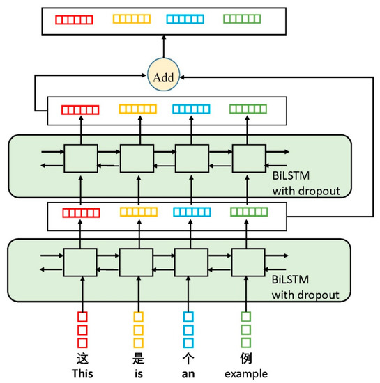 To alleviate overfitting, we follow a dropout layer behind each BiLSTM network. The basic structure of this enhanced encoding layer is shown in Figure 3. The weighted feature vectors after the residual connection using the merge operation (the shortcut) are used as the input of the decoding layer.