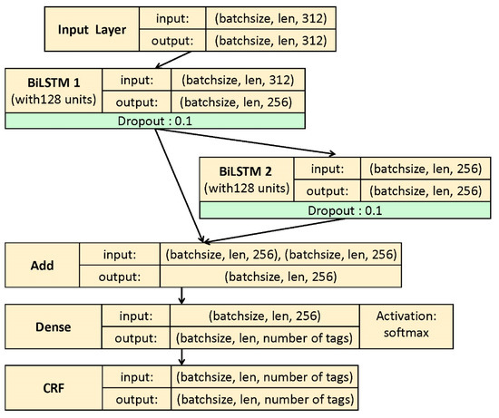 In this section, we describe the hyperparameters used in the proposed En2BiLSTM-CRF model. We use a tiny pre-trained ALBERT model [41] (version: albert_tiny_zh) to encode the input information, and the input is represented as 312-dimensional vectors. In this model, we use two BiLSTM networks with the same parameters (128 units), and they can convert the input feature representation dimensions into 256 output dimensions. We also use a dropout rate of 0.1 and use 0.01 as the default learning rate. In addition, the idea of the viterbi algorithm is used in the CRF layer to calculate the optimal solution. To clearly show details of the proposed method, we show the input and output shapes of each processing module in the entire model in Figure 4. Where “len” accounts for the length of the input, “batchsize” accounts for the number of batches during training, and “number of tags” means the types of sequence labeling of the text in the corresponding dataset. To ensure that the output dimension of each BiLSTM is 256, we set the number of units in these two BiLSTM networks to 128.
