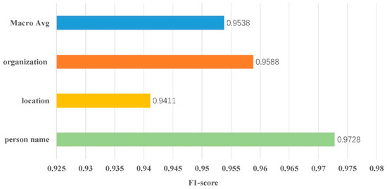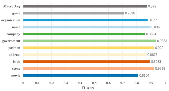 We also implemented statistics and a display of the test results of each entity on each data set. These statistical recognition results are shown in Figure 5 and Figure 6. The refined prediction results can help us analyze the detailed performance of the proposed model when identifying entity types with different data distributions.