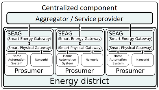 In particular, the SEAG is designed to cope with the heterogeneity of devices that are built by different vendors with different technologies. The SEAG is an IoT system which intelligently controls the physical devices included in the nanogrid and in the home automation system, and interacts with the local smart meters to build a detailed and comprehensive profile of the user’s energy production and consumption. In addition, the SEAG is in charge of interacting with the centralized component that includes the aggregator of the district and a service provider that supplies to the SEAGs high-level information needed for their local optimization tasks. Figure 1 shows the whole IoT architecture, including the prosumers and the centralized component.