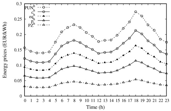 The electrical energy tariffs are defined by the daily trend of the energy market. In our scenario, the Italian energy market defines the wholesaler energy prices: the zone price () and the single national price (), i.e., the selling price and the basic buying cost applied at hour h when importing/exporting energy from/to the external grid. Conversely, the selling price and the buying cost applied to exchange energy inside the community are denoted, respectively, by , . To ensure that users are encouraged to share energy among them, it must hold that and .