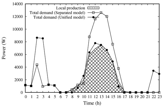 In detail, the “self-consumed” energy (i.e., the amount of energy produced locally and consumed by the prosumers of the community) is equal to 31.53 kWh with the Separated model, while it increases to 37.45 kWh when adopting the Unified model. On the other hand, the energy withdrawn from the grid is equal to 30.53 kWh with the Separated model, while it is reduced to 23.10 kWh when adopting the Unified model.