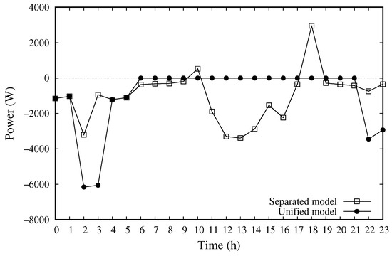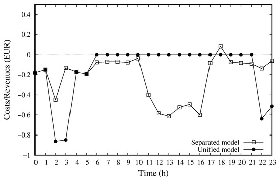 Figure 7 shows the values of the objective function during the considered day, i.e., the costs/revenues of the whole community obtained with the Separated and the Unified model. In the figure, negative values correspond to the purchase of energy while positive values correspond to the sale of energy. The Unified model allows the community to obtain significant cost savings with respect to the Separated model, especially in the second half of the day, when the energy produced by internal renewable sources can be exploited by other prosumers of the community. In particular, with the Unified model, no cost is incurred between 06:00 and 22:00, when the community is completely autonomous. Overall, the energy cost decreases from € 5.281 with the Separated model to € 3.584 with the Unified model.