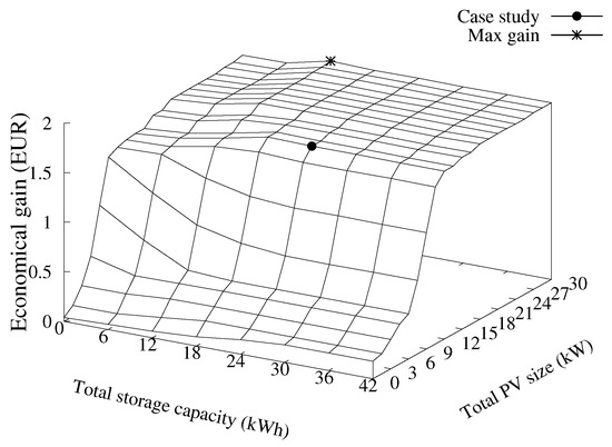 Figure 8 shows the economical gain achieved when using the Unified model with respect to the Separated model, computed as the difference between the values of the objective function obtained by solving the two models. This analysis is made by varying the overall storage capacity and the total PV size, in order to assess the impact of these parameters. The figure confirms that the Unified model always ensures a gain, whose value depends on the storage capacity and the PV size. To be more specific, the value of the gain increases with the total PV size: indeed, a larger availability of energy produced by local sources allows the users of the community to share a larger amount of energy and therefore to reduce the energy costs. The figure also shows that the economical gain is very low for values of the total PV size between 0 kW and 3 kW: the reason is that the energy produced locally is not sufficient to match the energy demand of the users, who need to withdraw energy from the grid with both the Separated and the Unified model. Another interesting insight is that the economical gain saturates to about € 1.772 when the total PV size exceeds 10 kW, i.e., the Unified model does not ensure further gains: the local sources produce an over-generation of energy that cannot be used by the community and is directly sold to the external grid, and the corresponding revenue is the same with both of the models. Finally, it can be seen that, with values of the total PV size between 3 kW and 10 kW, the economical gain increases when the total storage capacity decreases. In particular, with small values of the total capacity, the autonomy of users is limited: in such a case, a great advantage derives from sharing the available energy, which is only possible with the Unified model. On the other hand, with large values of the storage capacity, a large amount of energy can be stored and used at a later time, thus reducing the energy exchanges with the grid: in this case, the Separated model provides a solution of the optimization problem that is very close to that ensured by the Unified model. Figure 8 also shows the value of the gain for the specific case study considered so far, and detailed in Table 1: when the total capacity is 23 kWh and the total PV size is 14 kWp, the gain is equal to € 1.697. From the plot, it can be observed that this scenario corresponds to a nearly optimal sizing of the PV size and storage capacity, as the gain is close to the maximum value, also shown in the plot, and equal to € 1.789.