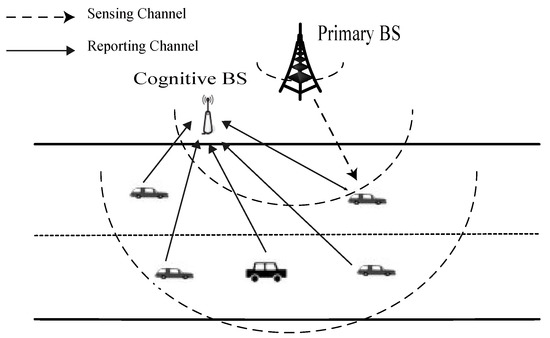 Over the last several years, we have witnessed spectrum sensing has been widely investigated [4,5,6]. Individual spectrum sensing is always compromised by multipath fading, shadowing and noise uncertainty. For this, cooperative spectrum sensing [7,8] has received more attention as it can take further advantage of both spatial and temporal diversity, and thereby garner better sensing accuracy and efficiency in the face of deep fading. However, it is worth noting that most of these efforts are focused primarily on a static network and scenario. As a result, they are much less suitable in a vehicular environment. Furthermore, it is all because it is of great importance to take into account the dynamic properties of cognitive environments and the environmental impact on radio propagation when designing sensing scheme for vehicle users [3,9].