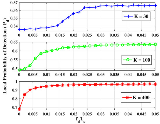 To begin with, we manifest the performance of ED-based spectrum sensing in non-collaborative cases, which is a key springboard of the study in the collaborative cases. To evaluate the effects of correlated fading on the detecting performance, Figure 4 provides the curves of the performance of local sensing based on energy detection as a function of the normalized Doppler shift . The temporal correlation coefficient is a decreasing function of , while is a linear increasing function of vehicle’s velocity v. In other words, high mobility makes the correlation among samples smaller. It is illustrated that the detection probability improves at a higher running velocity of vehicles. This is because lower correlation among samples or a greater number of samples could offer more information about received signal, and thus increase sensing performance. From Figure 4, we can also see that when , further increasing will not improve the probability of detection.