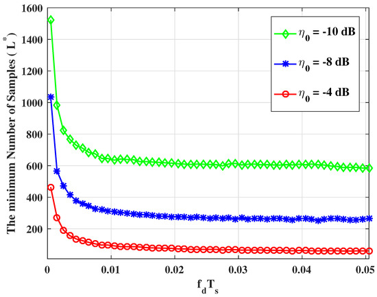 In Figure 5, we plot the minimum number of sampling observations required to obtain the desired values (). It is clear that the required number of sampling observations increased dramatically when the normalized Doppler shift, , is smaller.