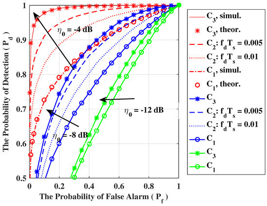 In order to elaborate more clearly the performance, the effects of various parameters on the detecting performance are illustrated in this section. The number of realizations made to compute the simulating probability of detection is 10,000, which are set to guarantee the simulation results can validate the theoretic analysis in the low probability region. The PU signal is a BPSK modulated signal and its power is set at 1. The sensing channel gain is a complex Gaussian random variable with mean 0, variance 1, and correlation coefficient , where . Here, is the carrier frequency of PU signal, is the sampling interval, and v is the movement speed of SVUs. The AWGN noise is produced in accordance with the target value of SNR . In this paper, = = 0.5 is assumed as a special case; however, the proposed approach is general. Without being explicitly specified, the key parameters used in our simulations are listed in Table 1.