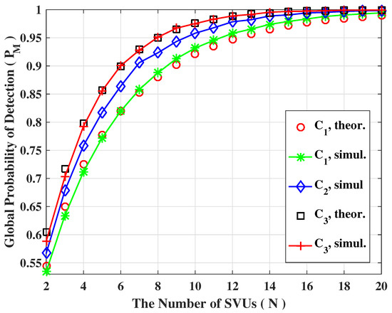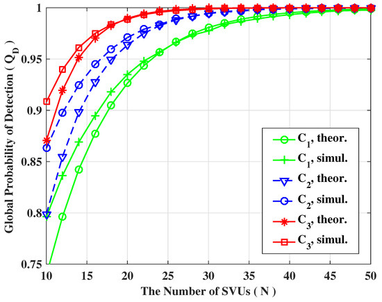 In the following, we are going to focus attention on cooperative cases. For any cooperation strategy, the number of SVUs participating in the cooperation is of utmost importance. In Figure 7 and Figure 8, the average probability of detection (/) are plotted as a function of the number of SVUs for soft fusion and hard fusion strategy, respectively. As expected, the sensing performance shows a upward trend as the number of SVUs increases regardless of fusion strategy. Regarding soft fusion, Figure 7 clearly demonstrate that the theoretical and simulating results also keep in consistent with each other for both and , confirming the accuracy of theoretical calculation. Regarding hard fusion, as can be seen from Figure 8, the fit between the theoretical and simulating results may not be very good when the number of SVUs is small but is very accurate for a relatively larger number of SVUs. Similarly, let us define the minimum number of SVUs, , which could be evaluated so as to satisfy the desired detection requirements as