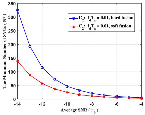 In Figure 9, we plot the minimum number of SVUs required to obtain the desired performance (). It is clear that, as the average SNR decreases, the gap between the required minimum number of SVUs for HF and SF based cooperative sensing is getting further apart, which is because energy detector performed poorly at low average SNR. Moreover, soft fusion has found favor in low traffic, while hard fusion might be preferred in dense traffic.