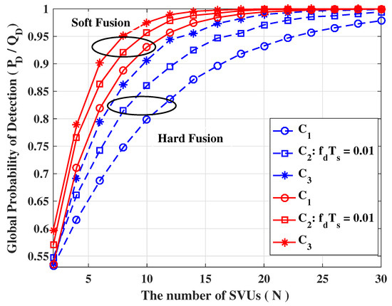 The detection probability of soft fusion scheme for various number of SVUs (, = −8 dB, = 0.1, = 0.01).