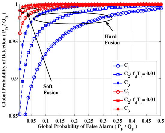 Throughout this paper on the performance, we will declare the local probabilities of false alarm, miss detection, and detection as , , and , respectively, whereas their global probabilities at the FC will be represented by , , and for soft fusion and , , and for hard fusion. denotes that X is a complex Gaussian distribution with mean and co-variance , while denotes that Y is a real Gaussian distribution with mean and variance . Let and denote the null and alternative hypotheses associated to the absence and presence of PUs in the considered band, respectively. The probability that the PU is absent is and present is .