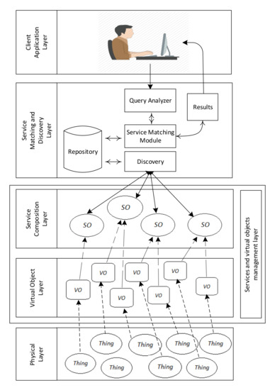 At the top, the client makes a request for any service that is handled by the service matching and discovery layer (SMDL). This layer first analyses the client’s query followed by incorporating any matching among services. Discovery and matching module picks SOs by composing several VOs through a shared repository.