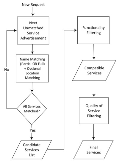 - Jia, B.; Li, W.; Zhou, T. A centralized service discovery algorithm via multi-stage semantic service matching in Internet of Things. In Proceedings of the 2017 IEEE International Conference on Computational Science and Engineering (CSE) and IEEE International Conference on Embedded and Ubiquitous Computing (EUC), Guangzhou, China, 22–23 July 2017; Volume 1, pp. 422–427. [Google Scholar]