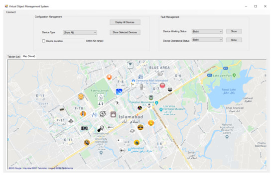 A total of 4000 devices are spread across central Islamabad, the capital of Pakistan. There are 32 types of devices (sensors and actuators). The profile of each device is created as VO in SQL that is composed of device id, URI, type, location, latitude, longitude, size of each property and total number of properties. A sample list of devices are shown on Google Map in Figure 4 over an area of 44,000 square meters. Table 1 lists down all the sensors and actuators used for sensing the environmental parameters and manipulation of the same respectively. The table also shows the corresponding properties of each device.