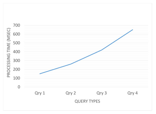 In Figure 6, different queries (with increasing complexity) are executed against fixed number (10,000) of IoT services. Complexity of the queries is increased by adding more and more filters. For primitive queries, the execution time is lesser as compared to complex queries. That is why significant increase in the response time is observed. The light sensors measure the value of light intensity in lux. Different types of queries are used to control the amount of lighting on the road network. Qry 1 is used to find out the amount of light from all light sensors based on name matching. The input/output parameters are compared for both sensors and actuators for ultimate matchmaking. Qry 2 specifies the location to be only sector H-8 in order to be more specific. In Qry 3, the threshold value of lux is taken into account that triggers the LEDs to be ON or OFF. The light sensors compare the computed lux value with a threshold. If lux < 1, LEDs on the road will turn ON otherwise they remain OFF. The level of QoS for each device is maintained manually that ranges from 1 to 10. The acceptable QoS range is 6 to 7. Table 2 lists down the structure of different types of queries used. The variation in queries successively consume more time to be executed as shown in Figure 6. The query size is increased by adding more conditions for precision. Upon increasing the size of different queries, the corresponding processing times increases.