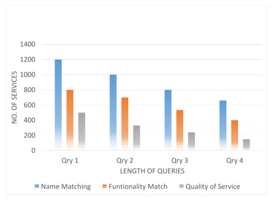 The number of matched services will decline with any increase in query size for service matching in Figure 7. Increasing the number of filters shows a declining graph. This is due to the increasing complexity of the proposed algorithm which yields lesser services as successive filters are applied.