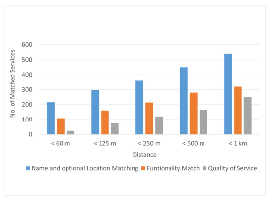 Upon decreasing the radius of geographic region, the number of services decreases passing all the three matching criteria. The last filter for service matching is the most affected among all shown in Figure 8. The devices are spread randomly and by restricting the radius results in fewer devices and services.