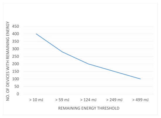 In Figure 9, it is obvious that as we increase the threshold value from 10 mJ to 499 mJ, the number of devices decreases. Varying the threshold of remaining energy level shows that there are fewer devices which are fully charged in a given time period.