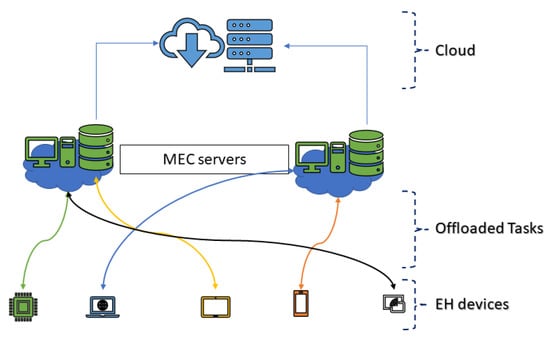 A new network paradigm known as Mobile Edge Computing (MEC) is introduced to liberate mobile devices from computationally intensive tasks. Several edge servers are deployed near the mobile devices aiming at a significant reduction in latency, congestion avoidance, and prolonging the network lifetime. Several IoT devices offload the heavy computation workload to the MEC devices such as base stations, access points, and so forth [2]. Integrating EH and MEC techniques contribute to improving computation performance and open new possibilities for cloud computing [3,4].