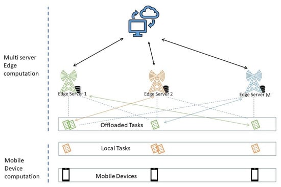 A multi-user, multi-server mobile edge computing systems with energy harvesting devices is considered. The proposed system model consists of N different mobile devices, and those devices have EH components. Many EH devices rely on renewable energy sources to captured stored for future use. This system also contains M MEC servers. Those servers will be used for the offloading purpose, and they are located at some distance D from EH devices. Mobile devices can use the wireless medium to access the MEC servers [42]. These servers are capable of performing computational tasks on behalf of mobile devices. In the experimental simulations, mobile devices and MEC servers are used. It is assumed that every device resides within the range of the MEC server. Through the proposed smart offloading strategy, the computational process can be boosted significantly. The system model of multi-server, multi-user computing systems is explained in Figure 2. Every energy harvesting device has two types of tasks. Some computation is done locally, while others will be offloaded to the server [43].