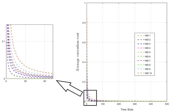 Quality of experience (QoE) cost depends upon the execution delay and cost of offloading the task. It can be calculated using Equation (15). The average QoE-cost is demonstrated in Figure 4 for all mobile devices. The proposed algorithm obtains this cost at each time slot. The average QoE cost starts with a maximum of J, and then it gradually starts decreasing. By using the proposed algorithm, a stable state of average QoE cost at the end of this graph is obtained. It shows the stability obtained by the proposed algorithm.
