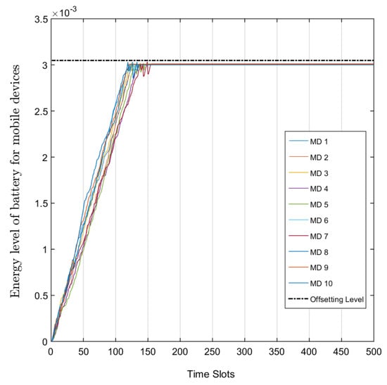 In Figure 5, the X-axis shows the number of time slots for energy harvesting devices, and the battery energy level is shown on Y-axis. There are 10 Mobile devices (MD) and one offsetting level. This graph depicts the variation in the level of average battery energy for different time slots. It shows significant improvement in stabilizing the energy level. It acquired the stability between 125th and 150th-time slots. The energy level starts increasing at the beginning and finally maintains an energy level close to the offsetting level for all mobile devices.
