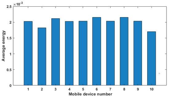 Figure 6 shows the average battery energy level of all mobile devices. The X-axis shows the index of the mobile device, and Y-axis shows the average energy level of the battery. All the devices maintained almost the same maximum level of energy, which ranges from 0.0017 J to 0.0021 J.